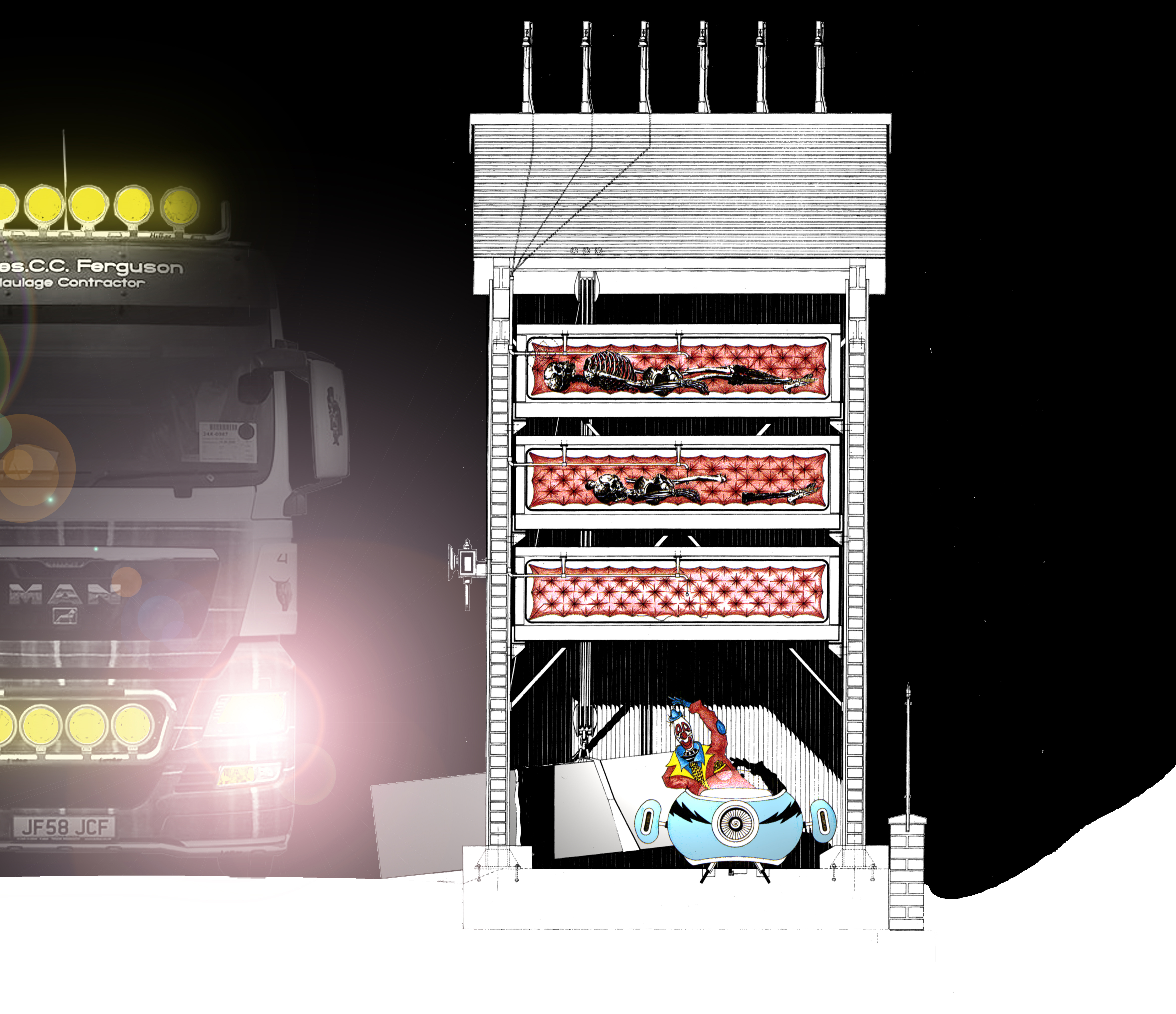 Every few years I work on the drawing a little, sometimes a repair; re-saturating the colour of some parts a little (the blue of the fair-ground car had completely disappeared), sometimes I make substantial alterations; the truck was added six or seven years ago. Also the background was white, not black. At least I think it was white, I can’t quite remember for sure.