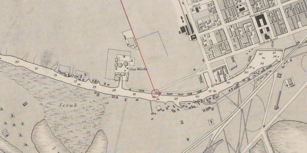 Figure 2. Beating the Bounds of Melbourne Town Common first filming location indicated in dashed red line. Using: Victoria, Australia, Port Phillip. Hobson Bay and River Yarra leading to Melbourne (1864). Creator deceased 1872, out of copyright. Source: National Library of Australia, Trove.