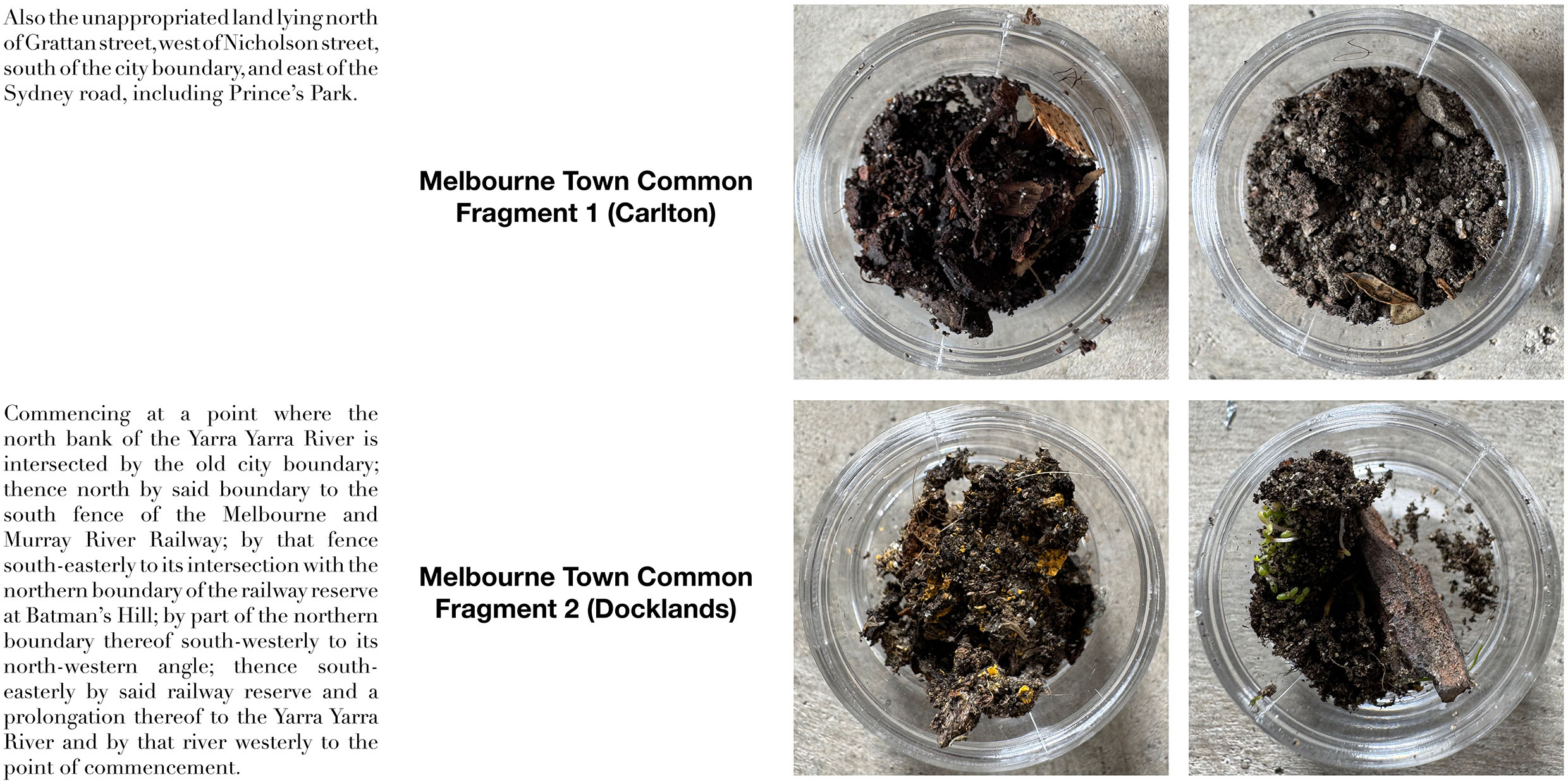 Figure 5. Text describing the boundary of Melbourne Town Common (Barkly 1863 [published 1915]). Soil collected at the boundary of old Melbourne Town Common (Suess and Zambelli 2025) – location as Figure 2., Alessandro Zambelli, 2025.