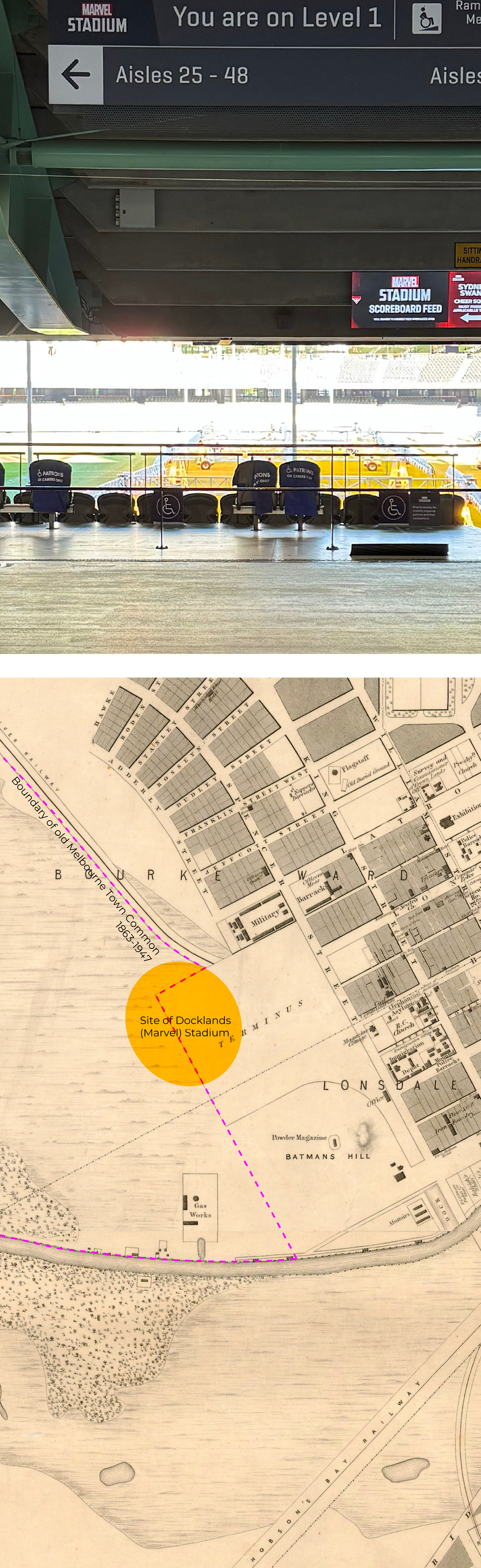 This image taken through Marvel Stadium – at once interior, building, landscape and city fragment – summons the old, intangible, border of Melbourne Town Common as it passes through it in the way shown on the map.